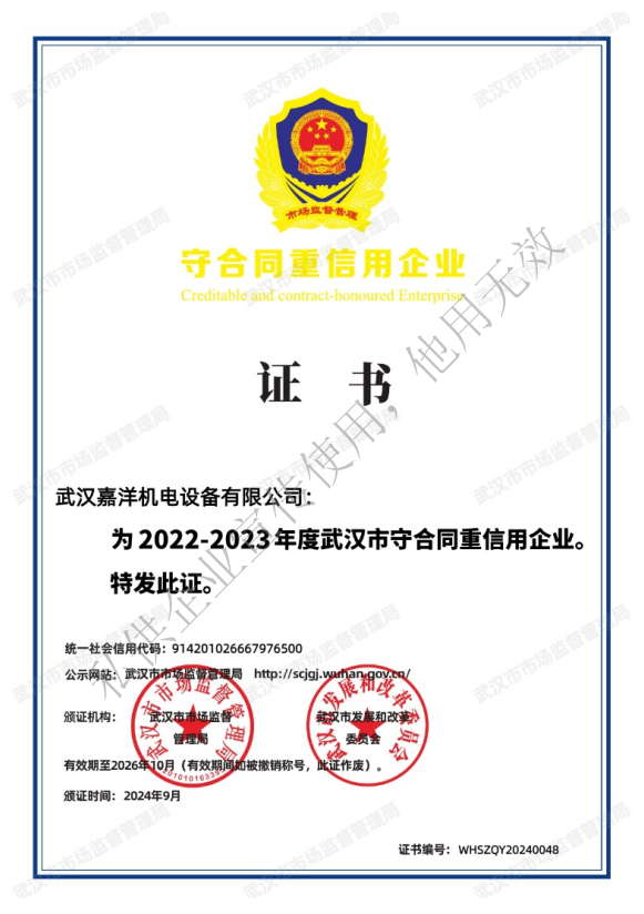 根據(jù)《湖北省合同監(jiān)督條例》《湖北省企業(yè)合同信用狀況公布暫行辦法》相關(guān)規(guī)定,省市場監(jiān)管局組織開展了湖北省第十七屆(2022—2023年度)“守合同重信用”企業(yè)公布活動。按照企業(yè)自愿申報、各地市場監(jiān)管部門審核推薦、省市場監(jiān)管局公開向社會征求意見等程序,省局研究同意,公布湖北省第十七屆(2022—2023年度)“守合同重信用”企業(yè),武漢嘉洋機電設(shè)備有限公司名列其中,喜獲殊榮。