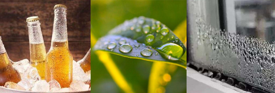 比如上面看到的冰箱里拿出的冰鎮(zhèn)啤酒,由于啤酒本身很冰,降低了它周圍空氣溫度,那么它周圍空氣里的水分就會(huì)在啤酒瓶身上形成結(jié)露。