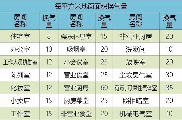 按室內(nèi)人員活動(dòng)數(shù)量決定新風(fēng)量。按國(guó)家標(biāo)準(zhǔn),人均新風(fēng)量需求是30立方米/小時(shí)。假設(shè),某一臥室的休息人數(shù)為兩人,那么此房間的新風(fēng)量需求為60立方米/小時(shí),有些區(qū)域例如客廳,可能會(huì)有客人來(lái)訪等因素,新風(fēng)量可以適當(dāng)放大。 如果人員不確定時(shí),可以采用每平方米地面面積換氣量[m³/(h·m²)],如表: