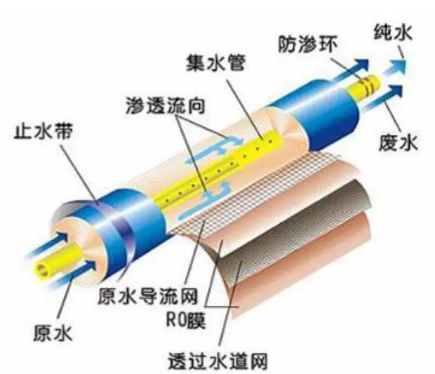 運(yùn)用特制的高壓水泵,將原水加壓至6-9公斤壓力,使原水在壓力的作用下滲透過孔徑只有0.0001微米的逆滲透膜?;瘜W(xué)離子和細(xì)菌、真菌、病毒體均不能通過。隨著廢水的排出,只允許體積小于0.0001微米的水分子和氧分子通過。該方式在不改變水的氧容量前提下,起到水凈化的效果。