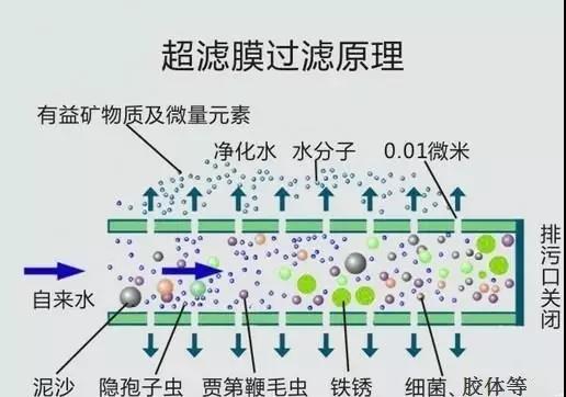 是以壓力為推動力,利用膜的不同孔徑對液體進(jìn)行分離的物理篩分。微濾膜孔徑一般在0.5-0.1微米,超濾膜一般在0.1-0.01微米,能有效過濾細(xì)菌病毒、色素、碳粉等大分子有機(jī)物,以及農(nóng)藥、除草劑、洗滌劑等低分子有機(jī)物、重金屬,并保留大部分礦物質(zhì)。