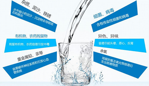 通常飲用水最主要的問題就是消毒用的余氯、有機化合物和重金屬幾大污染物質(zhì)。這些污染物質(zhì)的危害在于我們的身體無法將其分解或排泄掉,因此會隨著時間的推移在我們的身體里不斷的積累,最終對我們的身體造成無法逆轉(zhuǎn)的破壞。